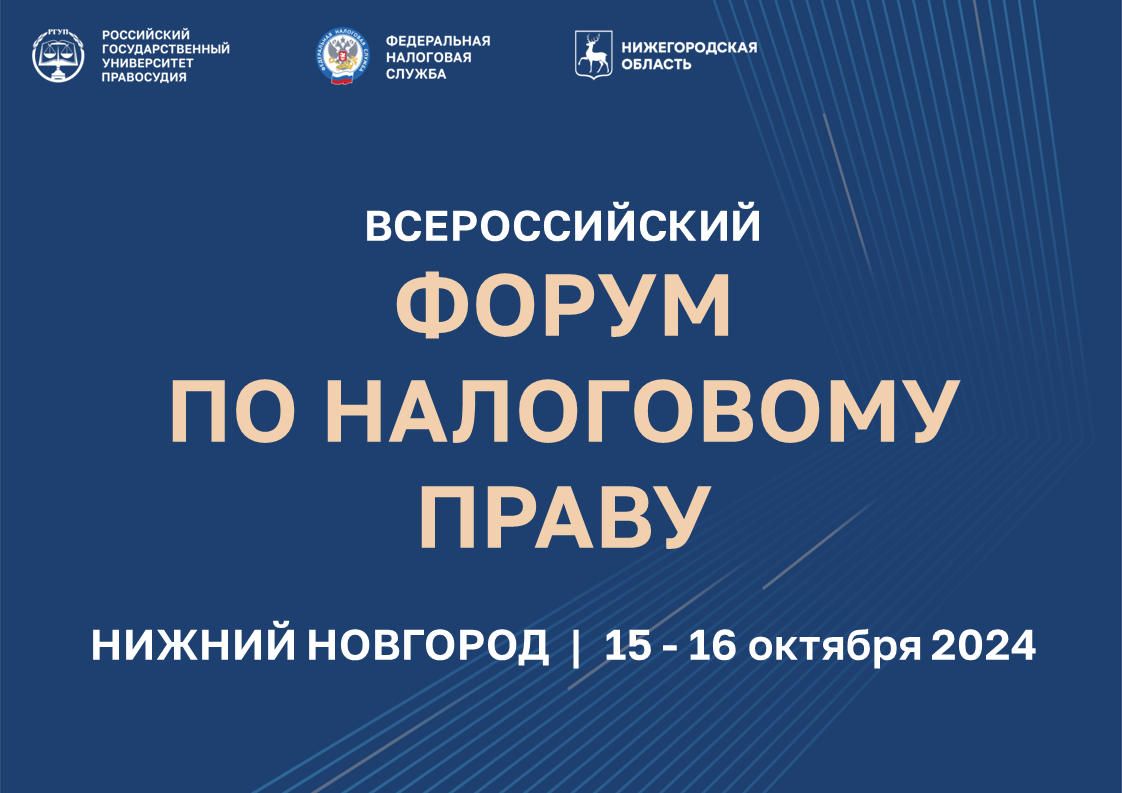 С 15 по 16 октября 2024 года на территории Нижегородской ярмарки пройдет Всероссийский форум по налоговому праву «Обзор изменений в законодательстве и правоприменительной практике 2025». Организаторами выступают Федеральная налоговая служба, Российский государственный университет правосудия, Правительство Нижегородской области.